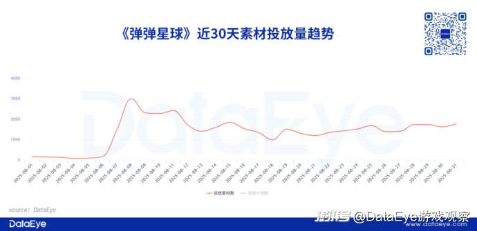 4399《彈彈星球》排名月度消耗榜第6名,消耗增長明顯,主要原因是同類型競品第七大道《新彈彈堂》具備先發(fā)和IP加持優(yōu)勢,《彈彈星球》作為后發(fā)產(chǎn)品,項(xiàng)目組需要思考如何快速搶量。DataEye-ADX投放數(shù)據(jù)顯示,《彈彈星球》在上榜前兩天突然提升投放量,單日投放素材數(shù)升至1400條,而次日達(dá)到投放數(shù)量峰值,單日接近3000條。