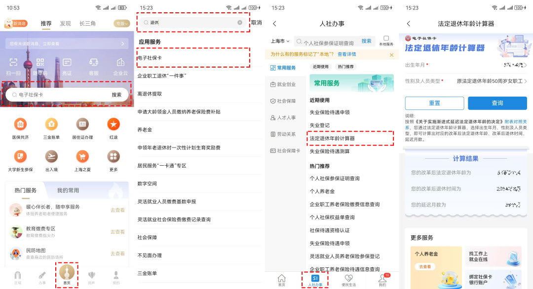 登錄“隨申辦市民云”APP→首頁搜索框中輸入關(guān)鍵字“退休”或“電子社??ā薄c(diǎn)擊“電子社??ā边M(jìn)入服務(wù)頁面→點(diǎn)擊“人社辦事”→點(diǎn)擊“法定退休年齡計(jì)算器”→選擇你的出生年月、性別及人員類型后,點(diǎn)擊查詢,即可得出退休年齡計(jì)算結(jié)果。