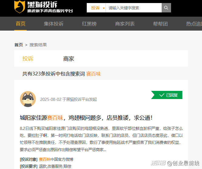比如在黑貓投訴上,關(guān)于賽百味的投訴達(dá)323條,包含吃出生雞肉、食材不新鮮、分量縮水、出餐速度慢和店員態(tài)度差等問題,引發(fā)公眾的擔(dān)憂。