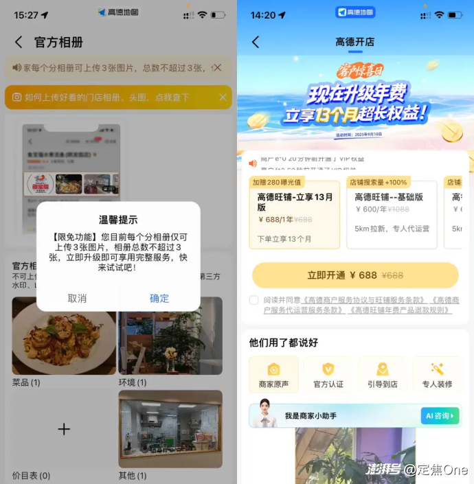 一名咖啡簡餐商家就向「定焦One」透露,在申請入駐高德商鋪時,很多信息需要開通“高德旺鋪”才可以填寫,如設(shè)置管理團購活動、分發(fā)優(yōu)惠券、上傳和更新商品信息等,甚至在沒有開通的情況下,門店照片只能上傳三張,目前開通界面顯示“高德旺鋪”基礎(chǔ)版本為600元/年,688元/13個月。