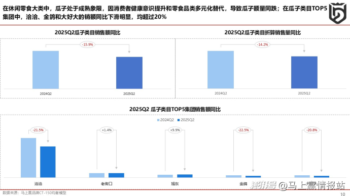 從銷售額同比變化來(lái)看,2025Q2瓜子類目銷售額同比下降15.9%,折算銷售量同比下降了14.2%,或可說(shuō)明瓜子類目正面臨顯著的市場(chǎng)壓力,市場(chǎng)上其他零食品類的多樣化替代以及消費(fèi)者健康意識(shí)的提升潮流下,消費(fèi)者對(duì)瓜子這一傳統(tǒng)零食的需求或許正在下降,對(duì)消費(fèi)渠道、消費(fèi)場(chǎng)景的習(xí)慣或許也正在改變中。