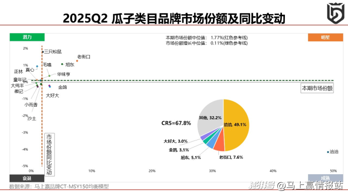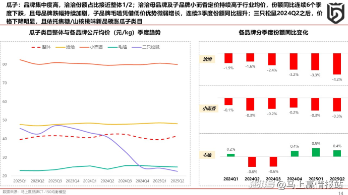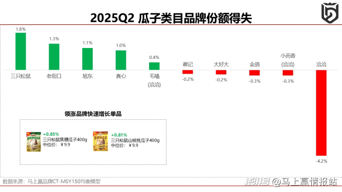 從2025Q2瓜子類目的品牌市場(chǎng)份額得失來(lái)看,三只松鼠表現(xiàn)優(yōu)異,市場(chǎng)份額同比增長(zhǎng)1.8%,尤其是“焦糖瓜子”和“山核桃瓜子”兩款單品憑借獨(dú)特風(fēng)味和較低價(jià)格,取得了單品快速增長(zhǎng)的好成績(jī)。老街口、旭東和真心三個(gè)品牌市場(chǎng)份額增長(zhǎng)也超過(guò)1%。相比之下洽洽作為瓜子類目市場(chǎng)份額最大的集團(tuán),品牌市場(chǎng)份額大幅下降4.2%,子品牌小而香與同為TOP5集團(tuán)的金鴿縮減0.3%,大好大和徽記下降0.2%??梢?jiàn),當(dāng)前瓜子類目傳統(tǒng)頭部品牌如面臨較大的市場(chǎng)競(jìng)爭(zhēng)壓力,份額被分流,市場(chǎng)品牌競(jìng)爭(zhēng)加劇,新品牌或部分品牌通過(guò)產(chǎn)品創(chuàng)新等方式搶占市場(chǎng)。