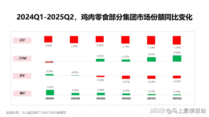 2025Q2 雞肉零食市場(chǎng)延續(xù)了低集中度、多品牌競(jìng)爭(zhēng)的格局,TOP10 集團(tuán)合計(jì)份額僅略高于 40%。幾個(gè)頭部集團(tuán)中,無(wú)窮品牌的市場(chǎng)份額表現(xiàn)出持續(xù)下滑的態(tài)勢(shì),各季度的同比下降幅度逐漸擴(kuò)大,從2024Q1的下降0.99%逐步加劇至2025Q2的下降1.30%。相比之下,王小鹵經(jīng)歷了從小幅下滑到持續(xù)上漲的過(guò)程。2024Q1小幅下降0.14%,但隨后逐步恢復(fù)并增長(zhǎng),2025Q2的市場(chǎng)份額同比增長(zhǎng)達(dá)到了0.94%。