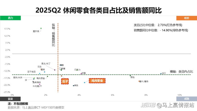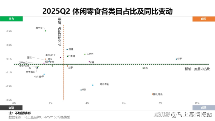 基于馬上贏品類洞察看板的四象限分析可以看到,在2025Q2,休閑零食市場(chǎng)呈現(xiàn)出較為明顯的品類發(fā)展差異。餅干、面包、薯片/薯?xiàng)l類目在休閑零食大類中占比7%以上,其中餅干類目占比最高且呈現(xiàn)同比增長(zhǎng),或可說(shuō)明其在休閑零食類目中的重要性進(jìn)一步增加。巧克力、軟糖、辣條和雞肉零食占比在4%左右,構(gòu)成中腰部陣營(yíng)。硬糖、口香糖、瓜子類目占比較低但同比變動(dòng)較為穩(wěn)定。其余品類則占比處于2%及以下。