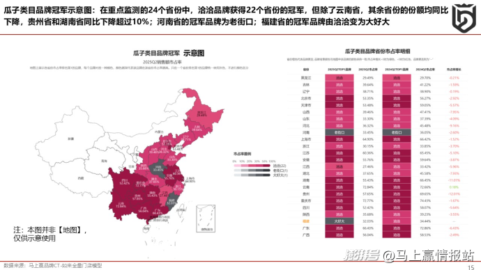 值得注意的是,部分省份的冠軍品牌發(fā)生了更替。河南市場(chǎng)依然是老街口領(lǐng)先,福建市場(chǎng)則由大好大取代洽洽成為區(qū)域第一。