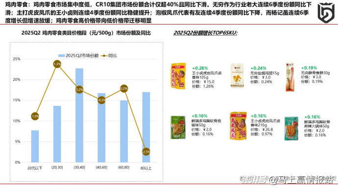 從2025Q2增長(zhǎng)單品來(lái)看,市場(chǎng)份額增長(zhǎng)最快的 SKU 既包括王小鹵虎皮鳳爪等中端明星產(chǎn)品,也有無(wú)窮鹽焗雞翅、鮮滿多雞胸軟骨等低價(jià)小包裝單品,不同層級(jí)的需求同時(shí)存在。