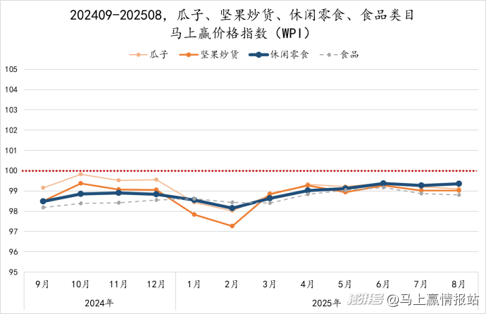 從2024年9月到2025年8月的馬上贏價(jià)格指數(shù)變化來(lái)看,在食品大類和休閑零食二級(jí)類目?jī)r(jià)格指數(shù)均保持相對(duì)穩(wěn)定的情況下,堅(jiān)果炒貨波動(dòng)較大,2024年底保持在99左右,2025年初有顯著下滑,2月降低至97,隨后迅速回升并保持在99上下。瓜子類目的價(jià)格指數(shù)波動(dòng)與堅(jiān)果炒貨基本一致,價(jià)格指數(shù)也始終未能突破100,年初價(jià)格指數(shù)下探或與2024/2025春節(jié)錯(cuò)位有一定相關(guān)。另外,瓜子類目?jī)r(jià)格指數(shù)在2024年9月至2025年2月始終高于堅(jiān)果炒貨,但自2025年3月起,其與堅(jiān)果炒貨價(jià)格指數(shù)差距明顯縮小。