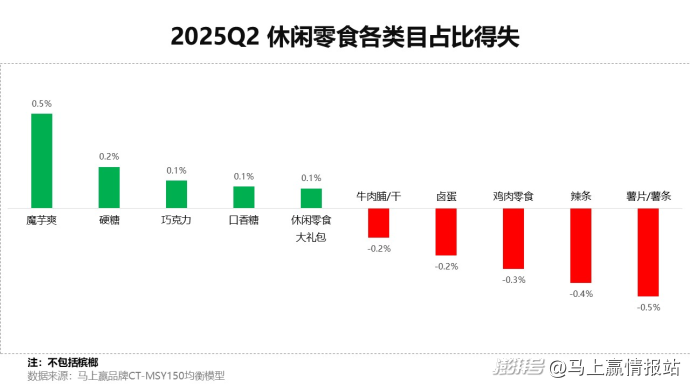 進(jìn)一步觀察類目的占比得失情況,可以看到,魔芋爽表現(xiàn)突出,占比同比增長(zhǎng)達(dá)到了0.5%,相比之下,硬糖、巧克力和口香糖類目雖然占比有所增長(zhǎng),但增長(zhǎng)幅度相對(duì)較小,傳統(tǒng)零食品類的市場(chǎng)需求趨于穩(wěn)定,變化不大。