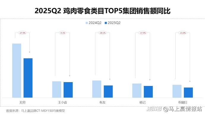 在2025Q2,受到該類目整體表現(xiàn)相對(duì)疲軟的影響,雞肉零食類目TOP5集團(tuán)銷售額均出現(xiàn)了同比下降。其中,無(wú)窮、有友、乖媳婦的銷售同比下滑較為嚴(yán)重,分別為-27.3%、-29.1%和-21%。相比來(lái)說(shuō),王小鹵的表現(xiàn)較好,下滑僅4.1%,是TOP5集團(tuán)中表現(xiàn)最好、同時(shí)也是唯一跌幅為單位數(shù)的集團(tuán)。