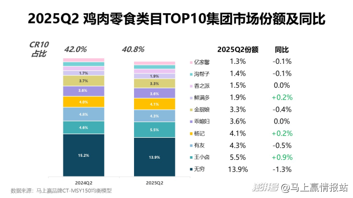 2025Q2雞肉零食類目TOP10集團(tuán)的集中度CR10市場(chǎng)份額合計(jì)為40.8%,較2024年第二季度的42.0%有所降低,市場(chǎng)集中度略有下降。