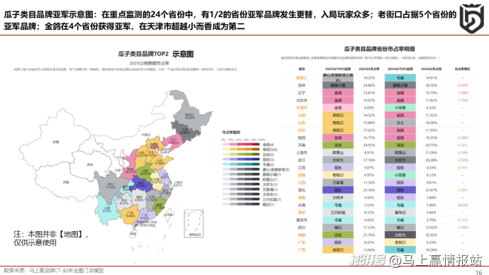 因?yàn)榍⑶⒃诖蠖鄶?shù)省區(qū)中依然保持領(lǐng)先,所以我們特別關(guān)注了瓜子類目在全國(guó)各省區(qū)中排名第二的品牌清單與變化情況??梢钥吹?,亞軍品牌在 24 個(gè)重點(diǎn)省份中有一半發(fā)生更替,顯示出競(jìng)爭(zhēng)日趨激烈、格局更加分散。老街口在 5 個(gè)省份獲得亞軍,金鴿在 4 個(gè)省份穩(wěn)居第二并在天津?qū)崿F(xiàn)對(duì)小而香的反超,旭東則在江蘇、湖北等地保持份額小幅增長(zhǎng),正在逐步穩(wěn)固“次梯隊(duì)”地位。與此同時(shí),大好大在浙江和福建表現(xiàn)突出,甚至在福建超越洽洽登上榜首。除全國(guó)性品牌外,真心、毛嗑(洽洽)、眼鏡小貓、萬(wàn)家嗑、徽記等區(qū)域或新銳品牌也在部分市場(chǎng)快速滲透,例如吉林眼鏡小貓份額超過(guò) 28%、四川徽記份額突破 13%,凸顯地方化競(jìng)爭(zhēng)力。當(dāng)前,瓜子市場(chǎng)正從洽洽主導(dǎo)向多品牌并存過(guò)渡,消費(fèi)者選擇趨于多元化,區(qū)域性和次梯隊(duì)品牌對(duì)龍頭的壓力正在持續(xù)增加。