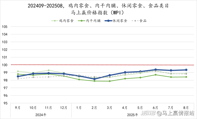 可以看到,2024年9月至2025年8月,食品類目整體價(jià)格指數(shù)相對(duì)穩(wěn)定,但始終低于100,大類整體存在一定的價(jià)格下行壓力。二級(jí)類目休閑零食的價(jià)格波動(dòng)相較更為明顯,價(jià)格指數(shù)整體略高于食品大類。肉干肉脯整體穩(wěn)定性較強(qiáng),雞肉零食的價(jià)格指數(shù)與肉干肉脯走勢(shì)基本一致,整體維持在99左右。綜合來(lái)看,休閑零食類目?jī)r(jià)格水平稍有回暖趨勢(shì),但依然面臨價(jià)格壓力。而雞肉零食價(jià)格水平同樣面臨壓力,但表現(xiàn)稍好于肉干肉脯整體。