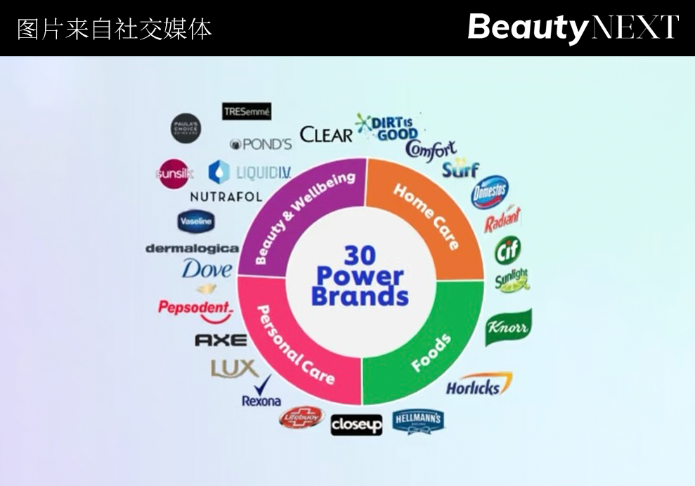 根據(jù)公開信息,這30個(gè)品牌中美妝個(gè)護(hù)品牌占比較多,除了其經(jīng)典品牌清揚(yáng)、旁氏、凡士林、力士、多芬等,還包括高端護(hù)發(fā)品牌K18、高端彩妝品牌Hourglass、洗護(hù)發(fā)品牌Nexxus等。