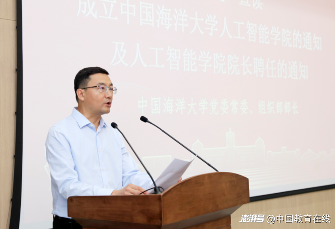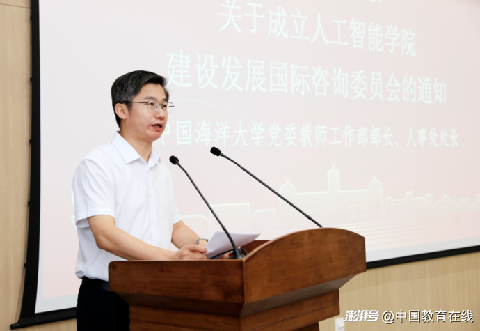 學(xué)校黨委常委、組織部部長蔣秋飚宣讀了成立中國海洋大學(xué)人工智能學(xué)院的通知及人工智能學(xué)院院長聘任的通知。學(xué)校黨委教師工作部部長、人事處處長毛相朝宣讀了關(guān)于成立人工智能學(xué)院建設(shè)發(fā)展國際咨詢委員會的通知。