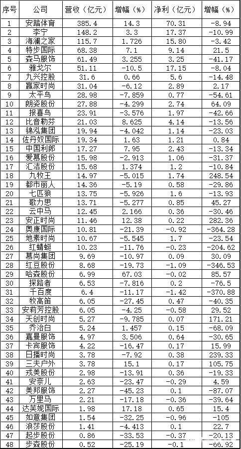 從營收來看,服飾行業(yè)呈現(xiàn)出顯著的“馬太效應”,企業(yè)規(guī)模已成為決定其經(jīng)營效益的關鍵因素,導致市場分化態(tài)勢日益加劇。百億以上規(guī)模的企業(yè)僅有3家,業(yè)績整體表現(xiàn)平穩(wěn),安踏以385.4億的營收領跑行業(yè),其次是李寧(148.2億元)與海瀾之家(115.66億元)。從營收增幅來看,李寧與海瀾之家繼續(xù)保持穩(wěn)健發(fā)展,安踏繼續(xù)保持兩位數(shù)的增幅。