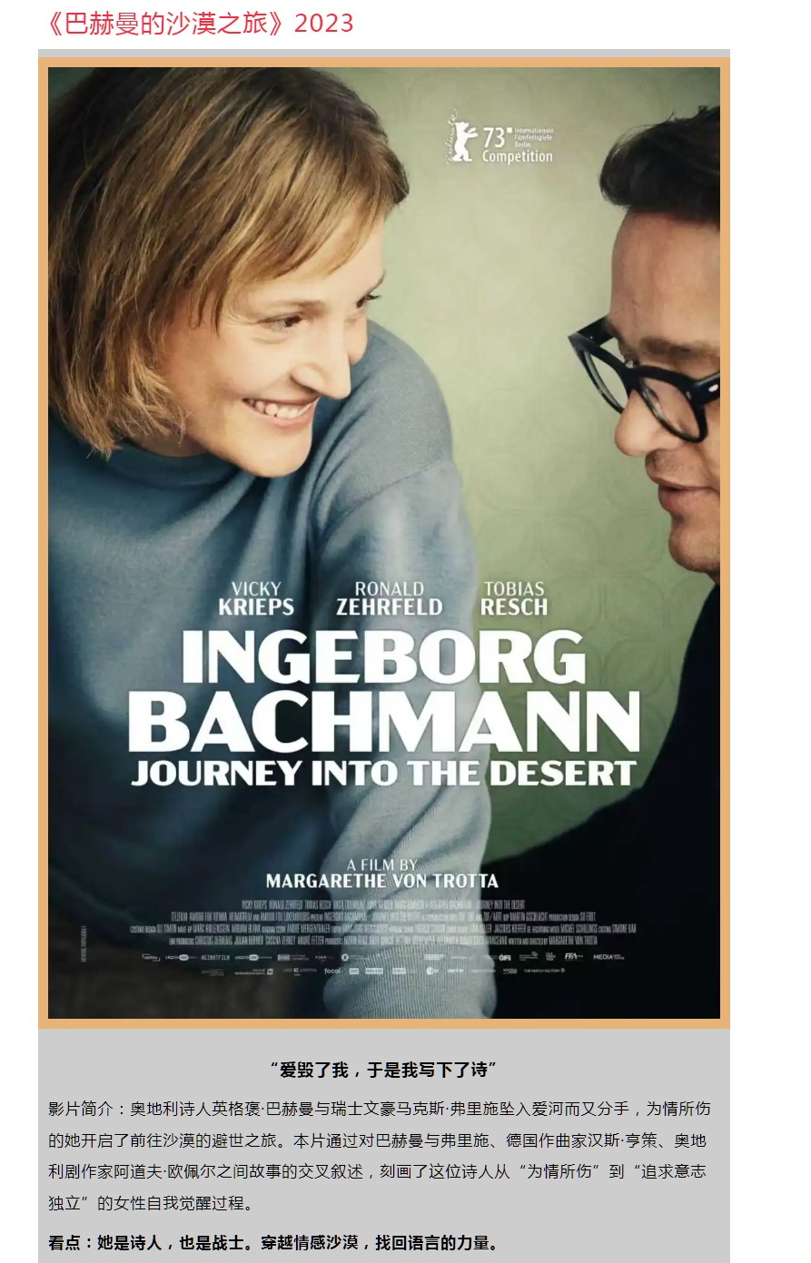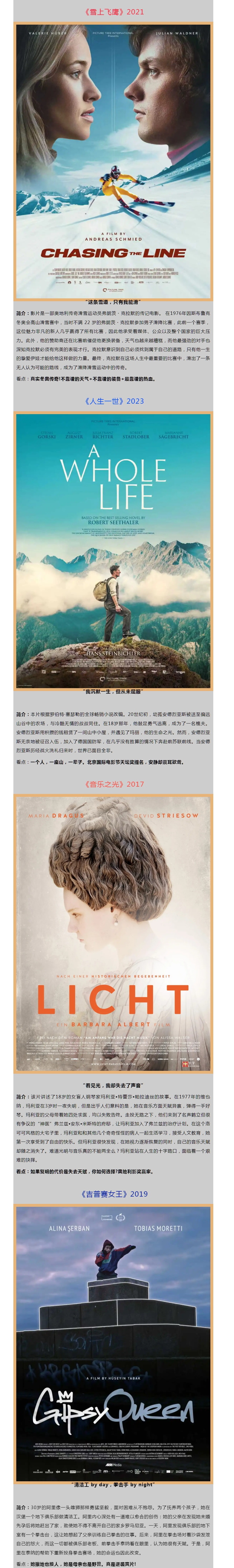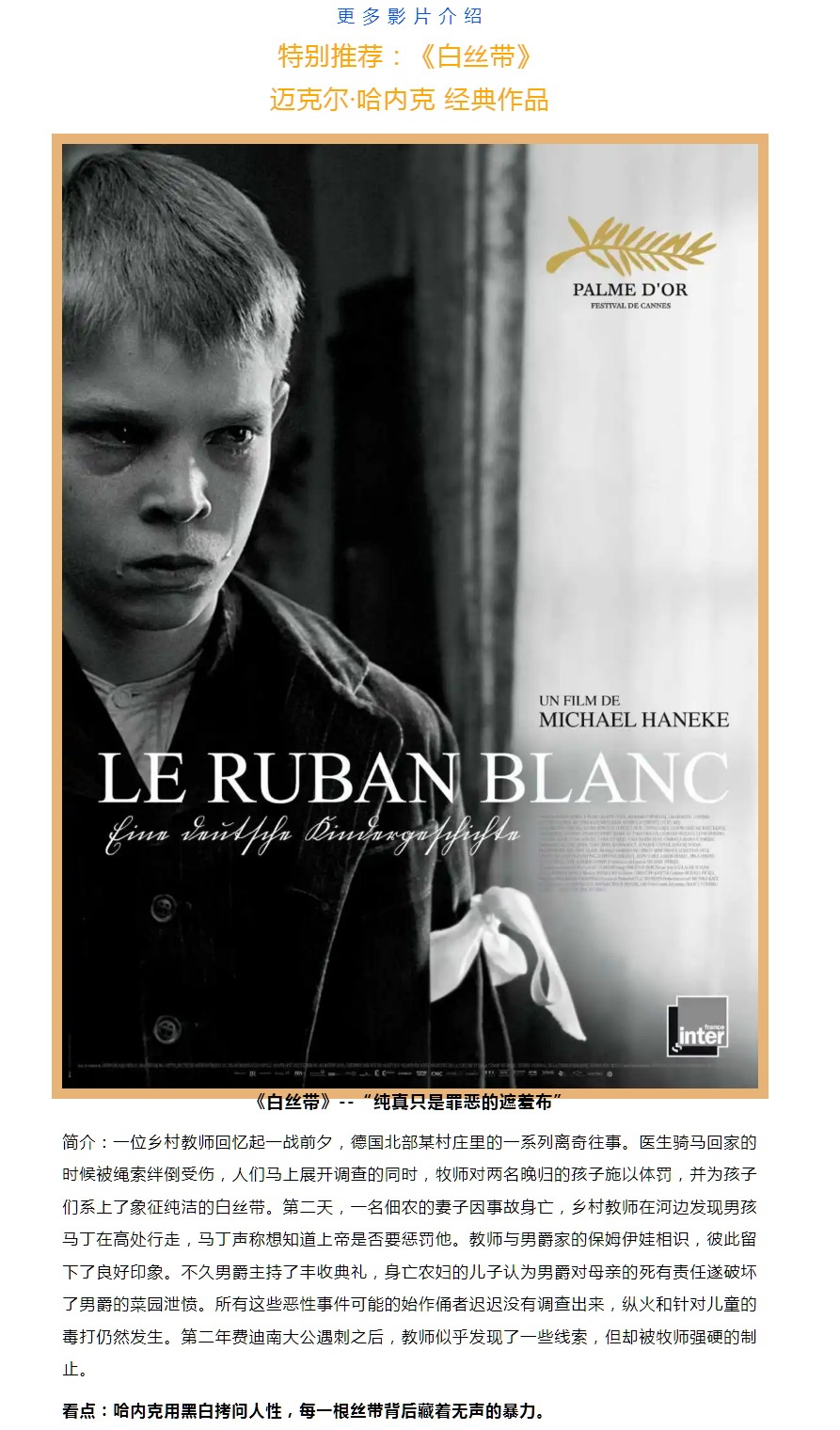 本次“奧地利電影展”由中影集團(tuán)和奧地利駐華大使館聯(lián)合主辦,展映影片涵蓋了近十多年以來,奧地利影壇涌現(xiàn)的名導(dǎo)佳作,包括邁克爾·哈內(nèi)克拿下戛納電影節(jié)金棕櫚大獎(jiǎng)的《白絲帶》、呈現(xiàn)詩人英格褒·巴赫曼如何走出情傷的《巴赫曼的沙漠之旅》、傳奇滑雪運(yùn)動(dòng)員弗朗茨?克拉默的傳記片《雪上飛鷹》、根據(jù)羅伯特·塞瑟勒暢銷小說改編的《人生一世》、以18歲的盲人女鋼琴家瑪利亞?特蕾莎?帕拉迪絲為主人公的《音樂之光》、女性拳擊片《吉普賽女王》等。
