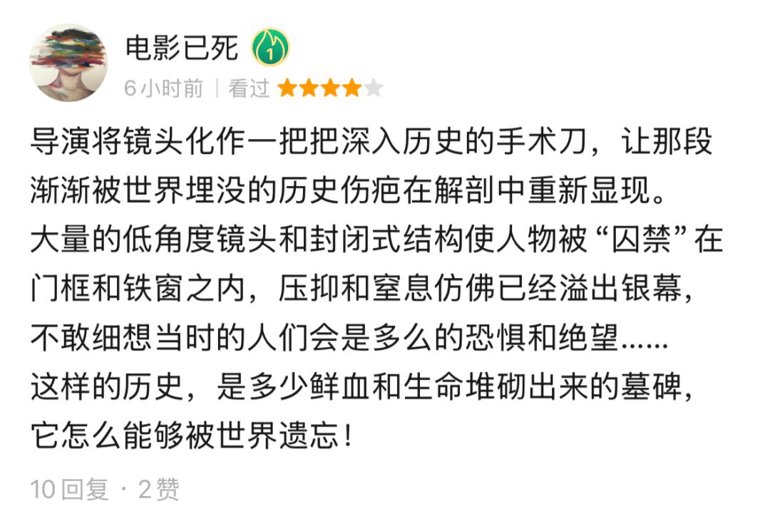 直至影片結(jié)束,影廳內(nèi)的燈光亮起,人們激動(dòng)交織著壓抑的心緒依然久久難以平復(fù)……