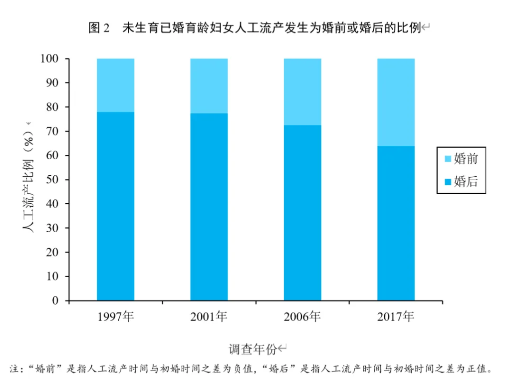剛剛說到避孕知識的匱乏,我們在準(zhǔn)備這期播客的時候,看到有一篇2021年的論文《中國已婚育齡婦女人工流產(chǎn)趨勢與特征》,對1997年到2017年四次全國生育狀況抽樣調(diào)查數(shù)據(jù)進(jìn)行分析發(fā)現(xiàn),雖然近年來已婚育齡婦女人工流產(chǎn)發(fā)生的風(fēng)險在逐步下降,但是婚后發(fā)生人工流產(chǎn)的比例仍高于婚前。比如2017年,婚前的人工流產(chǎn)比例是36.1%,婚后則達(dá)到了63.9%。這個調(diào)查結(jié)果還挺出乎我們意料的。