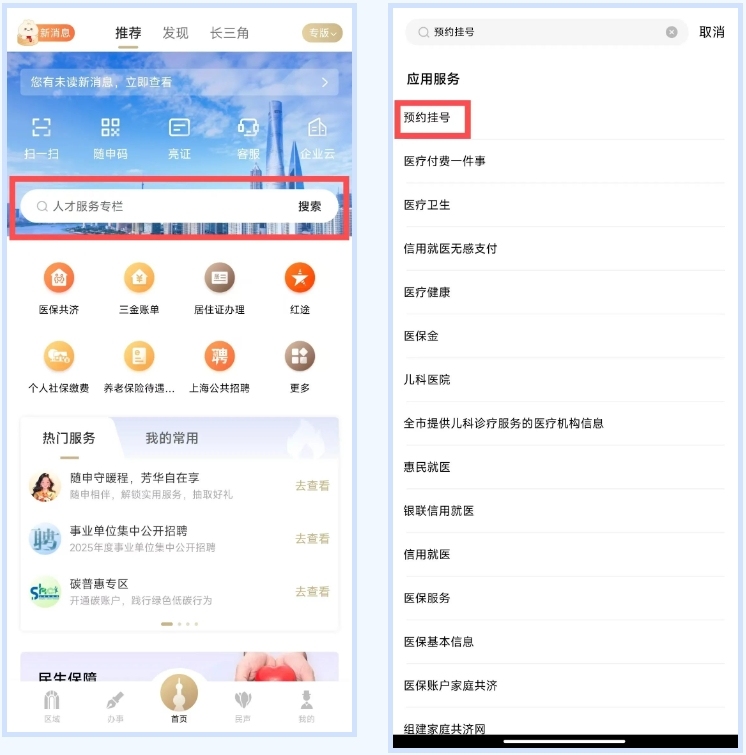 打開“隨申辦市民云”APP,首頁搜索關(guān)鍵詞“預(yù)約掛號”,點擊進入對應(yīng)服務(wù)。