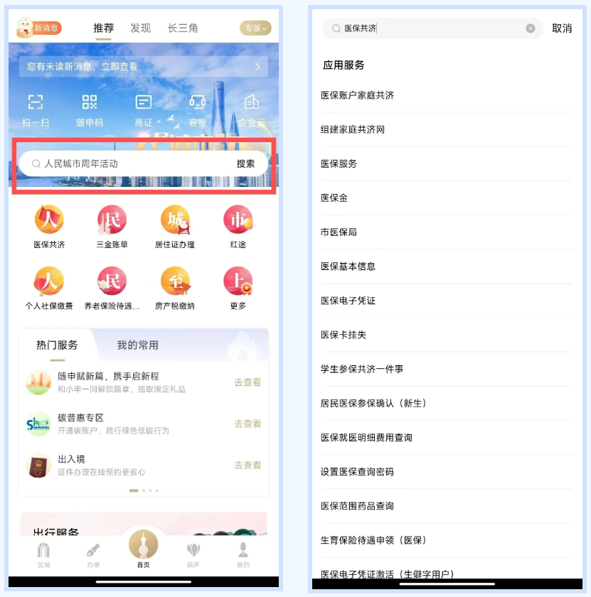 打開“隨申辦市民云”APP,首頁搜索“醫(yī)保共濟”,選擇“醫(yī)保賬戶家庭共濟”服務(wù)。
