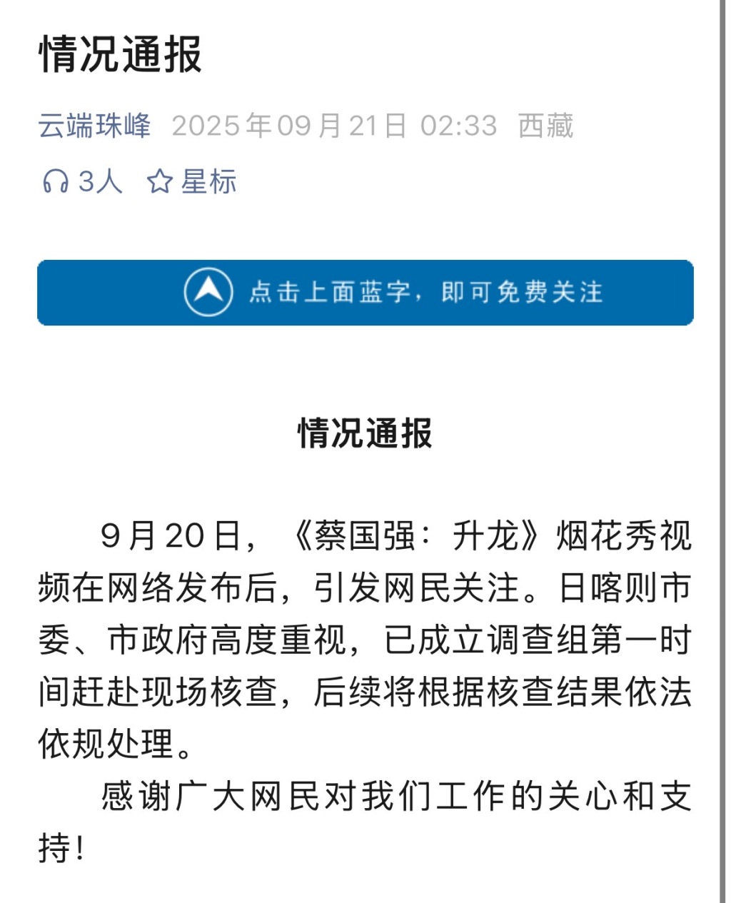 9月21日,“云端珠峰”微信公眾號(hào)發(fā)布情況通報(bào)指出,日喀則市委、市政府高度重視,已成立調(diào)查組第一時(shí)間趕赴現(xiàn)場核查,后續(xù)將根據(jù)核查結(jié)果依法依規(guī)處理。