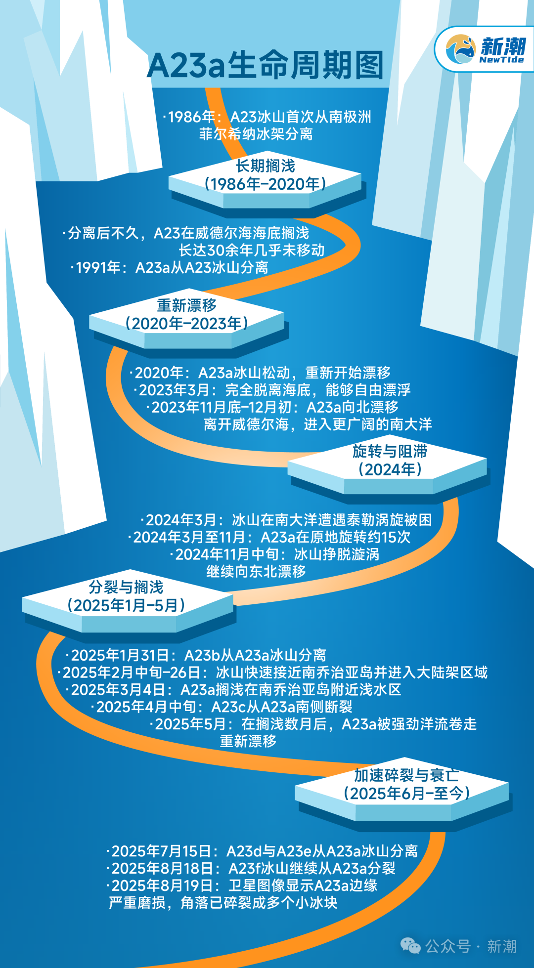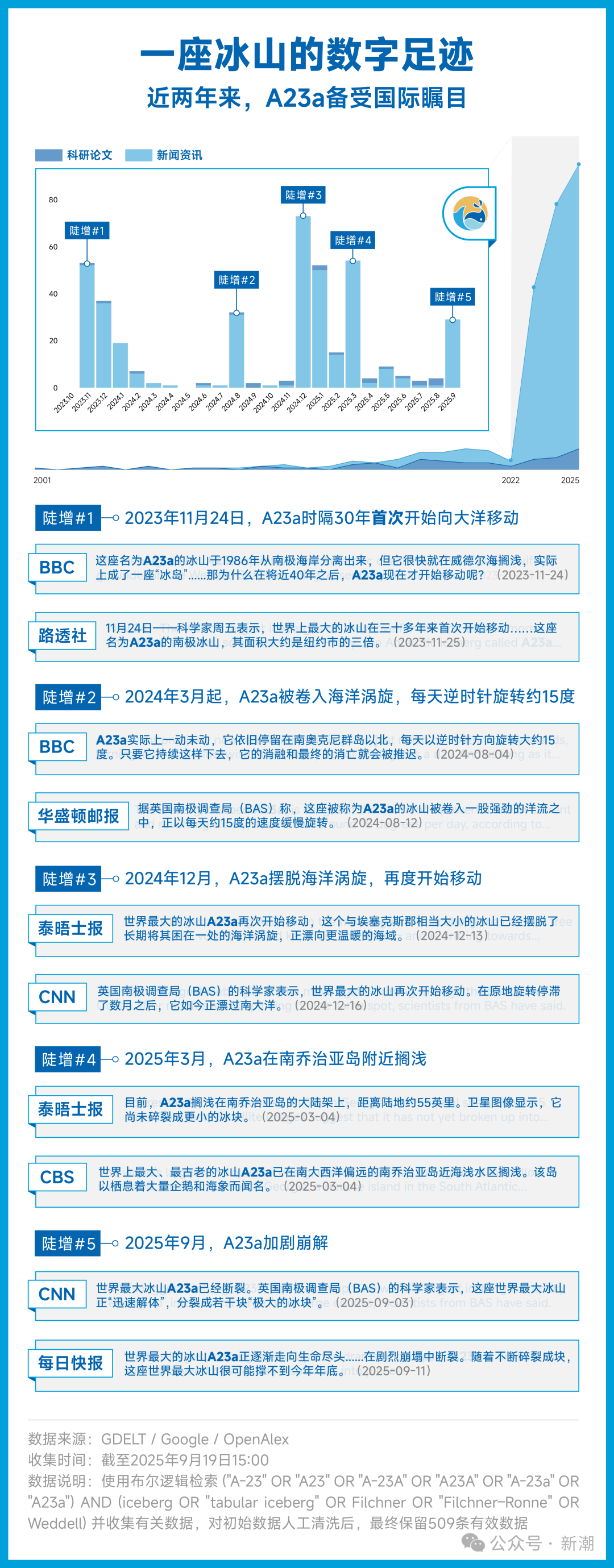 但我們不是孤立的存在。人類之所以還站立在地球上,之所以還創(chuàng)造著文明,一個(gè)重要的原因,是我們不止關(guān)注自身、關(guān)注眼前,我們還會關(guān)心遠(yuǎn)方、關(guān)心未來、關(guān)心人類共同的命運(yùn)。在A23a一去不返的路上,來自世界各地的五百余篇報(bào)道和論文為它留下了最后的注腳。