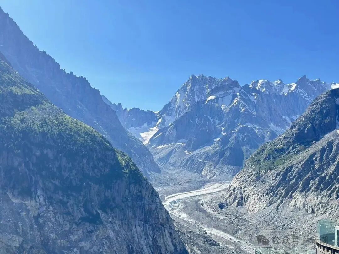 2024年夏天,南京大學(xué)地理與海洋科學(xué)學(xué)院的陳欣閱前往法國科考。在阿爾卑斯山脈勃朗峰附近的冰海冰川(Mer de Glace)前看到了一組照片。