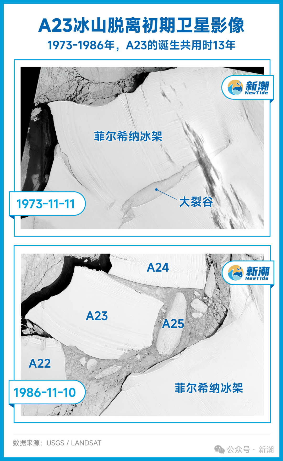 1956年,英國空中偵察小組在菲爾希納冰架上觀測到一道裂縫;1973年,裂縫化作一條下切的大裂谷。13年后的1986年,裂谷終于切割下冰架的一角,釋放出A22、A23、A24、A25等冰山。在這次規(guī)模浩大的崩裂中,蘇聯(lián)科考站德魯日納亞1號站被埋進(jìn)了冰山。