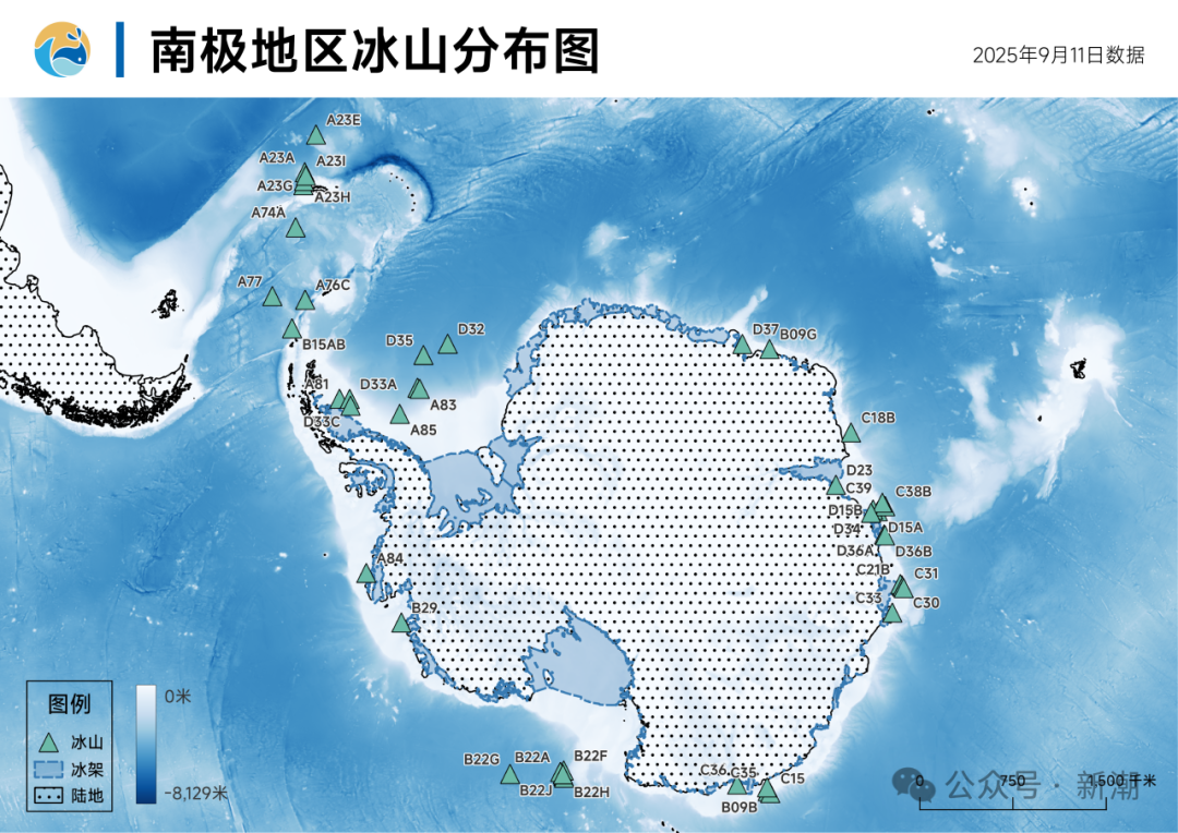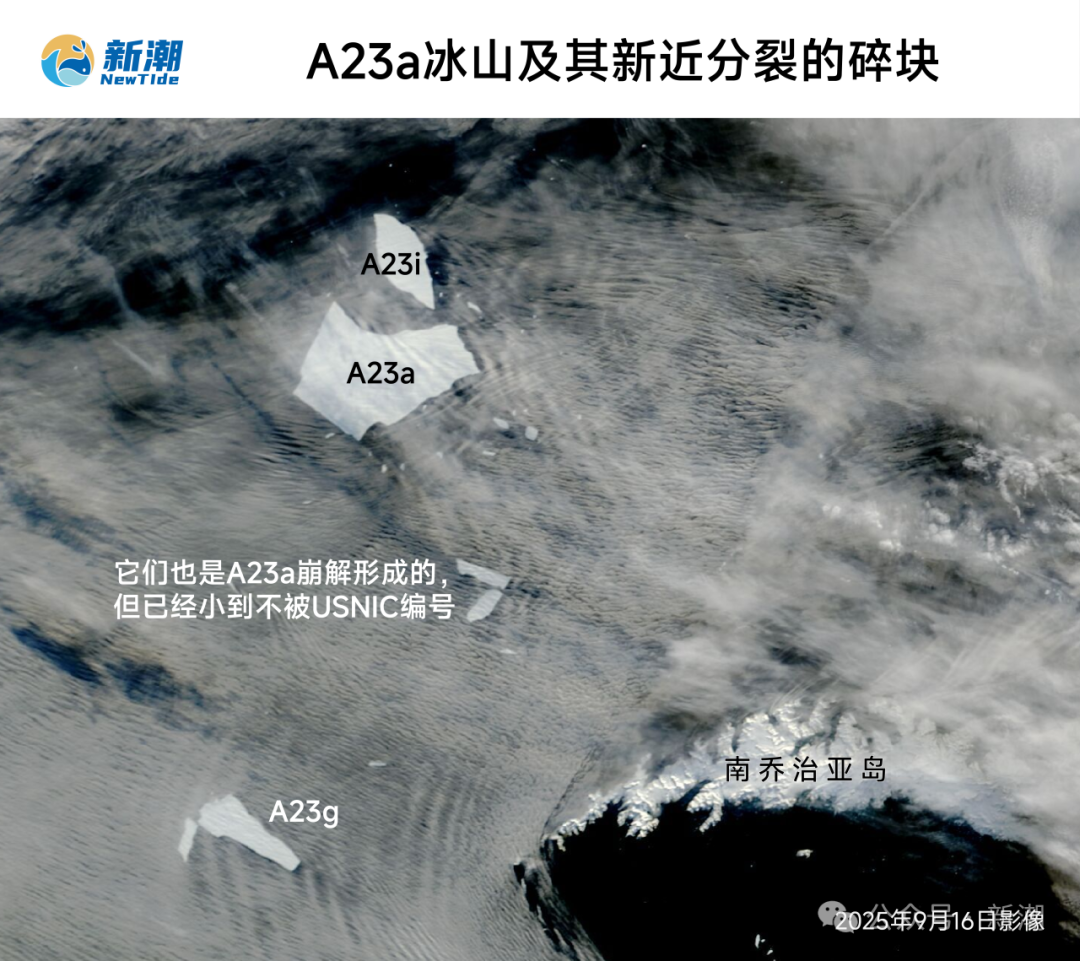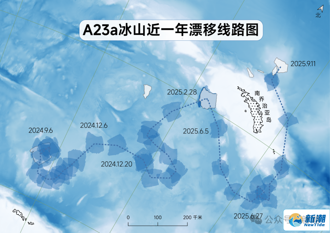 幸運(yùn)的是,A23a在南極繞極環(huán)流的作用下,從2025年5月重新開始向東移動,繞過南喬治亞島后,沿島嶼北側(cè)的大陸架向西折返,在這一過程中分裂出大大小小的碎塊。
