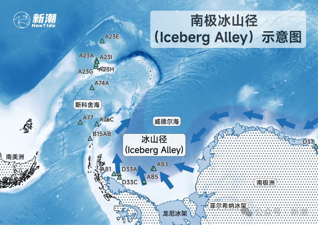 研究表明,90%的南極冰山都會被卷入沿岸流中,繞南極洲逆時(shí)針移動,在威德爾海匯合,然后向北進(jìn)入斯科舍海,在那里被卷入繞極環(huán)流,這條路徑被學(xué)者稱作“冰山徑”(Iceberg Alley)。