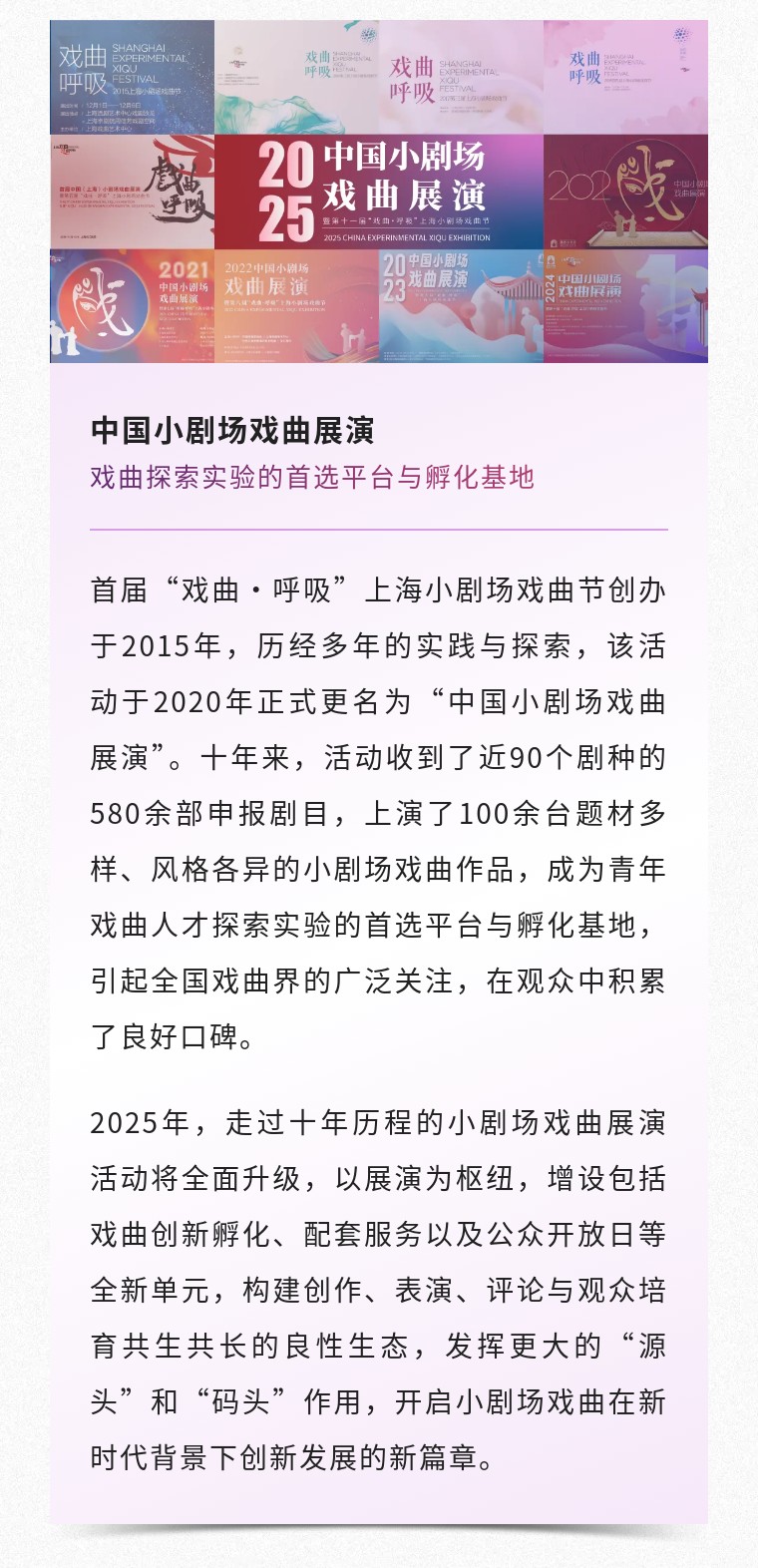 為鼓勵傳統(tǒng)戲曲在當代語境下的創(chuàng)新表達,推動戲曲藝術(shù)高質(zhì)量傳承發(fā)展,由中國戲劇家協(xié)會、上海市文學(xué)藝術(shù)界聯(lián)合會、中共上海市黃浦區(qū)委宣傳部、文匯報社、上海戲曲藝術(shù)中心主辦,上海市劇本創(chuàng)作中心、上海藝術(shù)研究中心、上海市戲劇家協(xié)會聯(lián)辦的“2025年中國小劇場戲曲展演”,擬于2025年12月至2026年2月期間在上海舉辦。