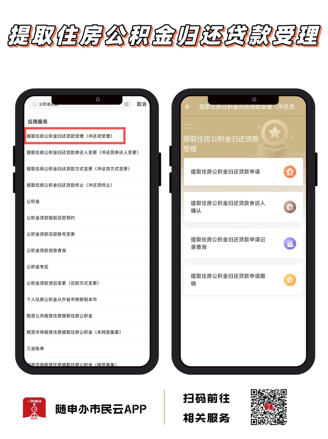 第一步:登錄“隨申辦市民云”APP,進(jìn)入提取住房公積金歸還貸款受理(沖還貸受理)服務(wù),點(diǎn)擊進(jìn)入。