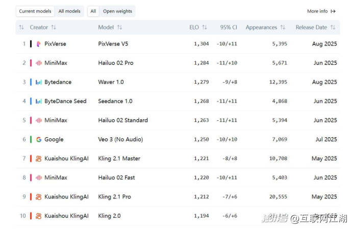 其中,一個反直覺的表現(xiàn)是:在同樣是今年6月、8月的模型更新中,無論是文生視頻,還是圖生視頻,“小廠”愛詩科技們的排名反而要比字節(jié)們更好。