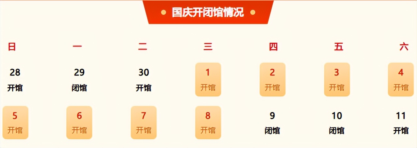 【開館時間】10月1日(星期三)—8日(星期三)正常開館,9:00-18:00(17:30停止入館)。