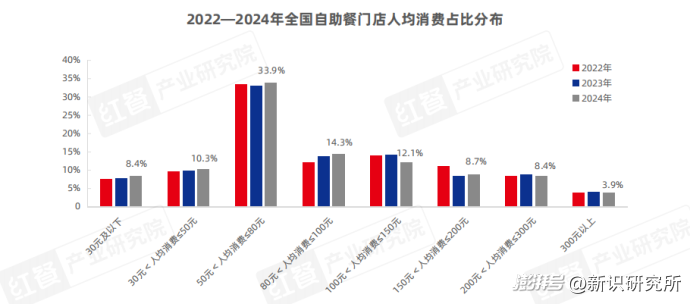據(jù)紅餐大數(shù)據(jù)顯示,2022-2024年自助餐的人均消費有下滑趨勢。截至2024年,全國自助餐人均消費在80元及以下的門店數(shù)占比為52.6%,比2023年提高了1.9個百分點;人均消費在100元及以下的門店數(shù)占比為66.9%,比2023年提高了2.4個百分點。