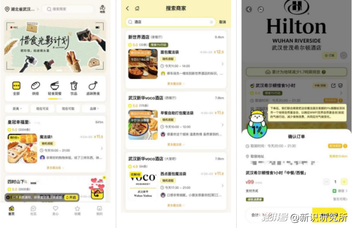 “線上預(yù)約/付款+線下自提/用餐”的模式,讓盲盒成了都市人的“深夜補(bǔ)給站”。打開“惜食魔法袋”APP,附近一般會顯示面包店、便利店的多,在搜索欄輸入酒店,就會顯示該地所有參與的酒店名稱和價格,選擇某家酒店并確認(rèn)訂單付款,就可直接前往所在地。