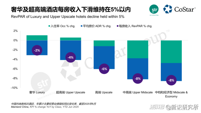 據(jù)STR資訊數(shù)據(jù)統(tǒng)計,中國酒店市場則仍處于緩慢恢復(fù)階段,2025年上半年整體RevPAR(每間可供租出客房產(chǎn)生的平均實際營業(yè)收入)同比下降5%,入住率和平均房價雙雙下滑。