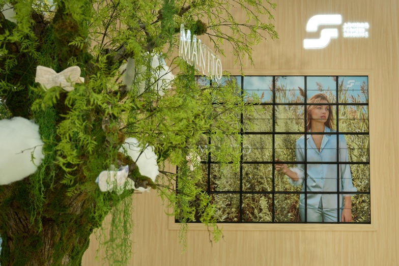 展區(qū)內(nèi),一棵枝丫上帶著陣陣云彩,樹梢上懸掛著精美的眼罩裝飾的小樹,屹立在人潮涌動(dòng)的步道旁。這就是加拿大桑蠶絲品牌MANITO用自己最擅長的蠶絲藝術(shù)設(shè)計(jì)而成的全新環(huán)境裝置——MANITO OASIS。