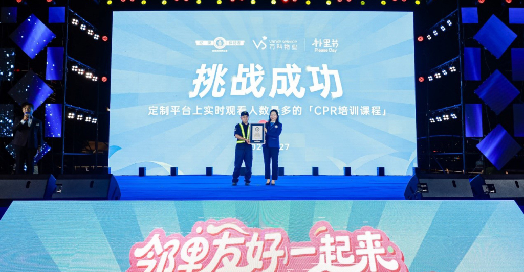 作為本屆樸里節(jié)最引人注目的環(huán)節(jié),當(dāng)晚18:55,一場(chǎng)“定制平臺(tái)上實(shí)時(shí)觀看人數(shù)最多的心肺復(fù)蘇(CPR)培訓(xùn)課程”吉尼斯世界紀(jì)錄挑戰(zhàn),在上海梅奔中心旁的主會(huì)場(chǎng)挑戰(zhàn)成功,全國業(yè)主通過萬科物業(yè)“鄰居好服務(wù)”視頻號(hào)直播間在線學(xué)習(xí)CPR急救知識(shí),直播間實(shí)時(shí)觀看人數(shù)最高達(dá)20,917人,直播總觀看人數(shù)超過10萬人次。