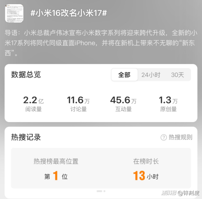 綜合這部分用戶的心理,他們認為新品跳過16改叫小米17的行為,是對小米自身品牌力的一種否認,因為真正的行業(yè)龍頭是不屑于對標任何品牌的,而總是拿自己跟別人作對比,本身就透露出一種的不自信。
