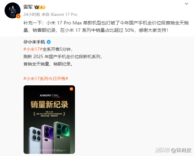 最終的市場反饋是檢驗一切對標舉措的標準:9月27日10時,小米17系列全渠道開售,直接刷新2025年國產手機首銷紀錄。其中,得到雷軍重點推薦的小米17 Pro Max,單款機型打破今年國產手機全價位段首銷全天銷量、銷售額紀錄,在小米17系列中銷量占比超50%。