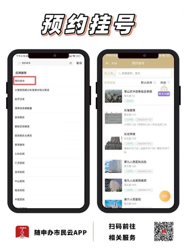 “隨申辦市民云”APP【預(yù)約掛號(hào)】,選醫(yī)院選科室選醫(yī)生,提前預(yù)約及時(shí)就醫(yī)