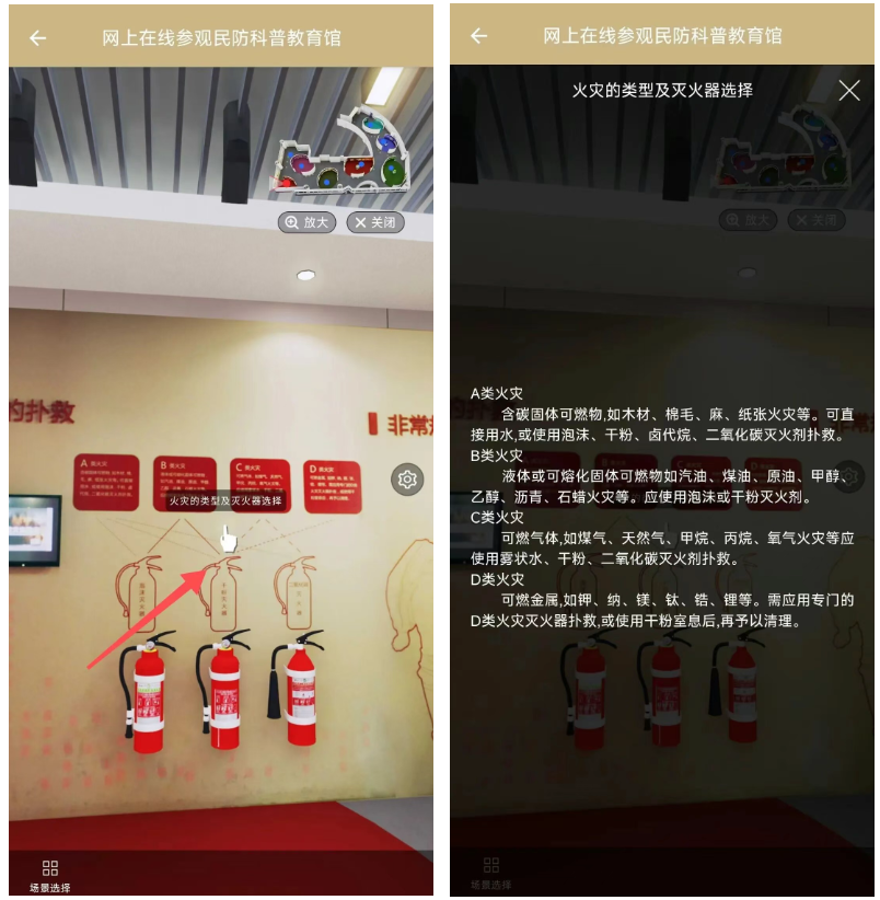 第二步:以消防知識(shí)為例,點(diǎn)擊下方場(chǎng)景,即可跳轉(zhuǎn)至不同場(chǎng)景觀看。