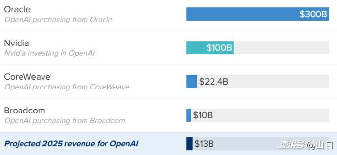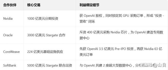 9 月末,Nvidia 宣布向 OpenAI 注資 1000 億美元的消息,讓納斯達克與標普 500 指數(shù)創(chuàng)下歷史峰值。這距離 OpenAI 與 Oracle 達成 3000 億美元的 "星際之門"(Stargate)合作協(xié)議僅過去兩個月,而在此之前,CoreWeave 剛剛將其 AI 基礎設施供應額度從 119 億美元翻倍至 224 億美元。在這場算力軍備競賽中,OpenAI 的交易清單正以百億級單位快速拉長。