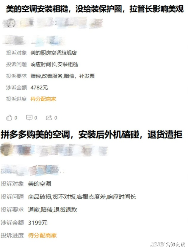 鋅刻度從黑貓投訴平臺觀察到,關(guān)于美的空調(diào)的投訴高達8360條,其中有人提及自己購買的美的空調(diào)遲遲無人送貨,后來在安裝空調(diào)時也是坎坷重重;也有人說購買的美的空調(diào)剛使用就壞了,要求啟動100天只換不修服務(wù),也被反復(fù)推脫,沒有得到積極的售后態(tài)度;又或者是安裝空調(diào)十分粗糙、因安裝不當(dāng)造成外機損傷……涉及各方面的投訴問題諸多。