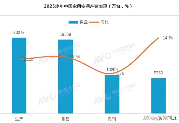 剛剛結(jié)束的2025冷年(即2024年9月至2025年8月),得益于國補政策、高溫等客觀環(huán)境,中國空調(diào)市場實現(xiàn)了產(chǎn)銷雙增的狂歡——2億臺產(chǎn)量、1.96億臺銷量,內(nèi)銷與出口均實現(xiàn)穩(wěn)健增長。