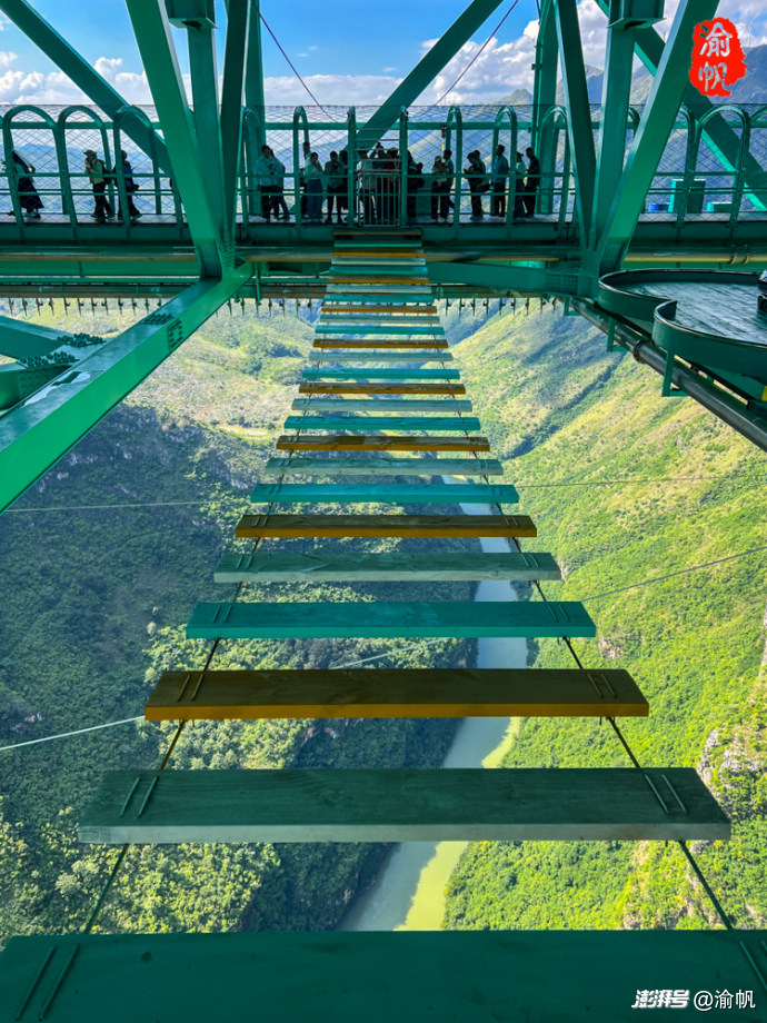 在橋體下方的中段,是由20塊透明玻璃板組成懸空觀景臺,下面是深不見底的花江大峽谷,走在上面如云端漫步,旁邊則是全球最高的高空蹦極臺,挑戰(zhàn)者可以從625米高空縱身躍下,以200公里時速直墜峽谷,在失重與反彈間感受“地球裂縫”的震撼回響。