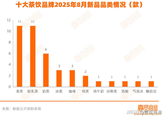 輕乳茶穩(wěn)居C位。9個品牌共推出11款輕乳茶新品,較7月減少3款。如茶百道“陽光青提冰奶”以茉莉花茶為底,搭配新鮮青提與牛乳;益禾堂“四季春輕乳茶”則依托烏龍茶底的清香,弱化奶味的厚重感,精準迎合市場對清爽口感的追求。