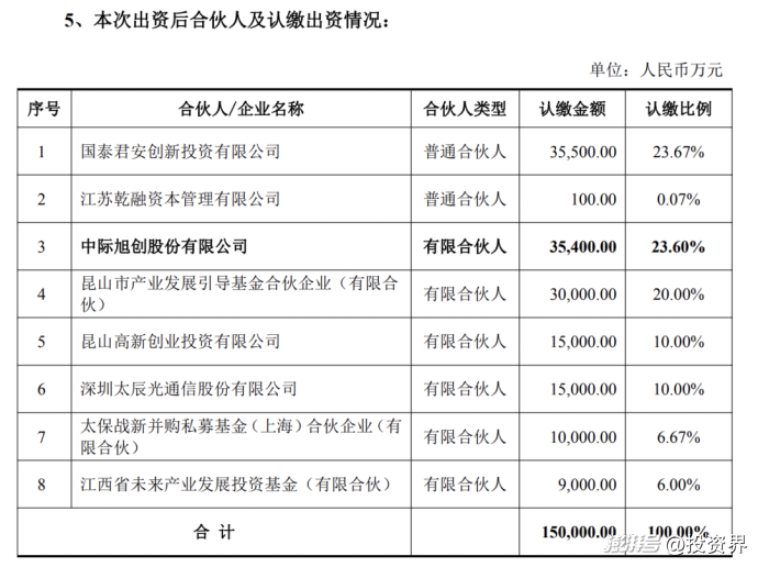 其實(shí),從基金名稱就可以看出,這是一只與中際旭創(chuàng)關(guān)聯(lián)密切的基金。出資方面,中際旭創(chuàng)拿出3.54億元,認(rèn)繳比例達(dá)23.6%,是最大LP。