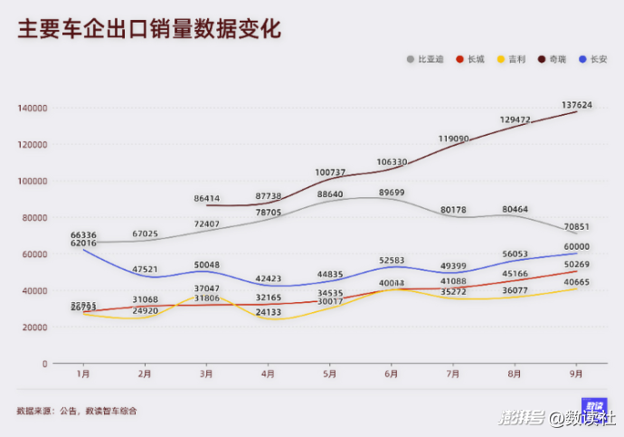 目前,海外市場(chǎng),奇瑞仍然處于領(lǐng)先地位。9月奇瑞海外銷量高達(dá)137624臺(tái),連續(xù)5個(gè)月銷量破10萬(wàn)臺(tái)。